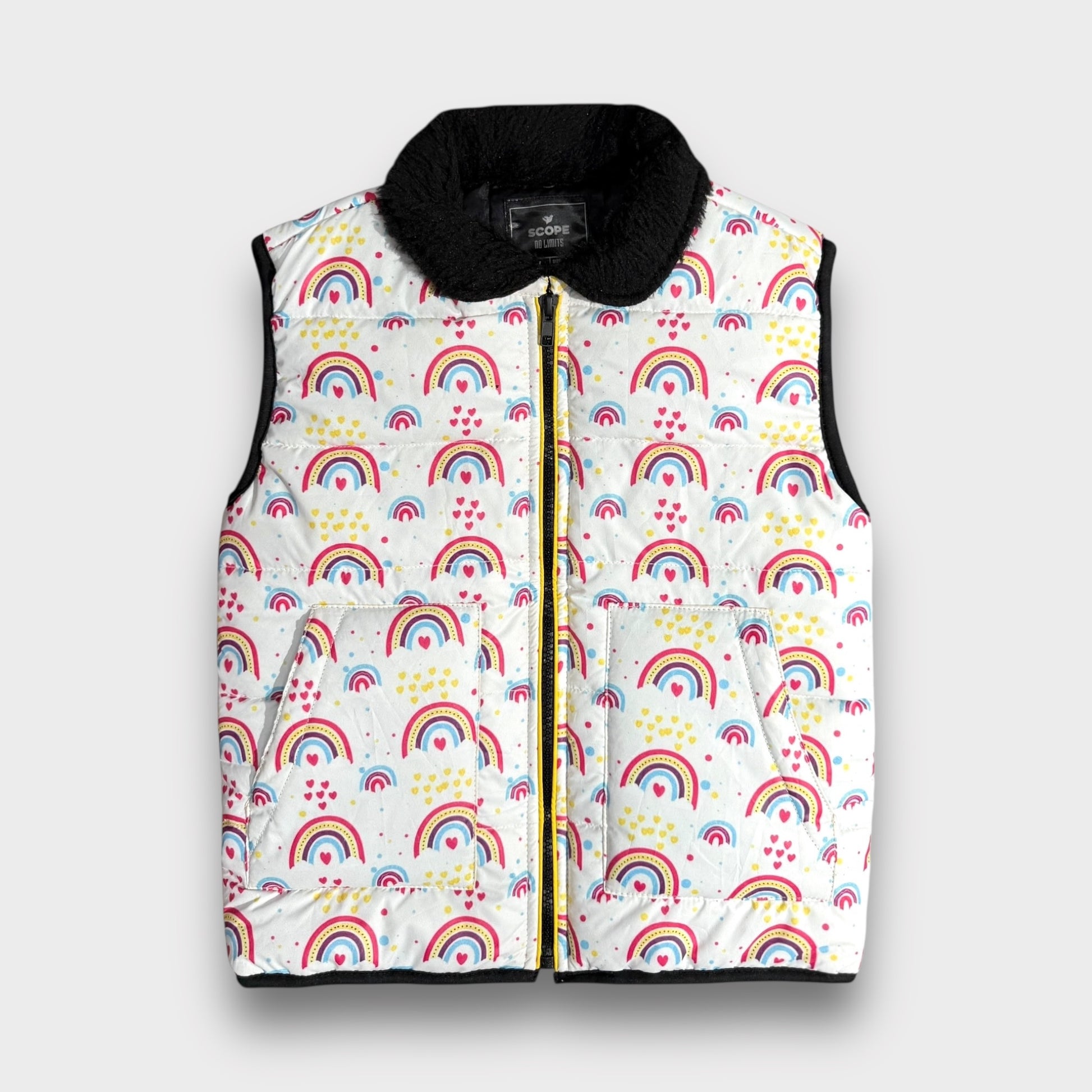 Rainbow Sleeveless Puffer Jacket with Fur on Collar
