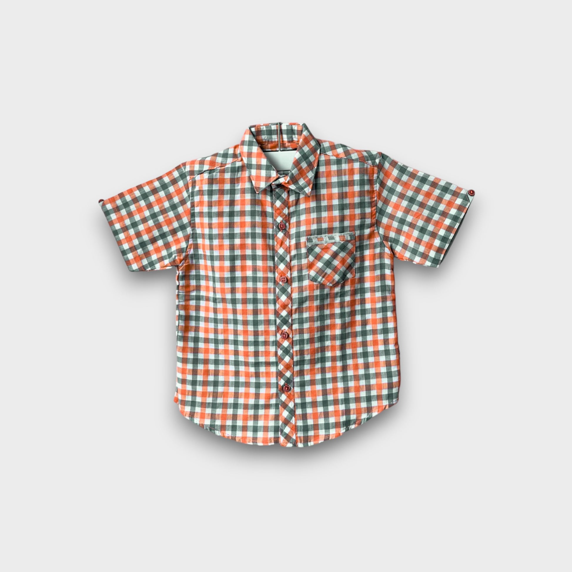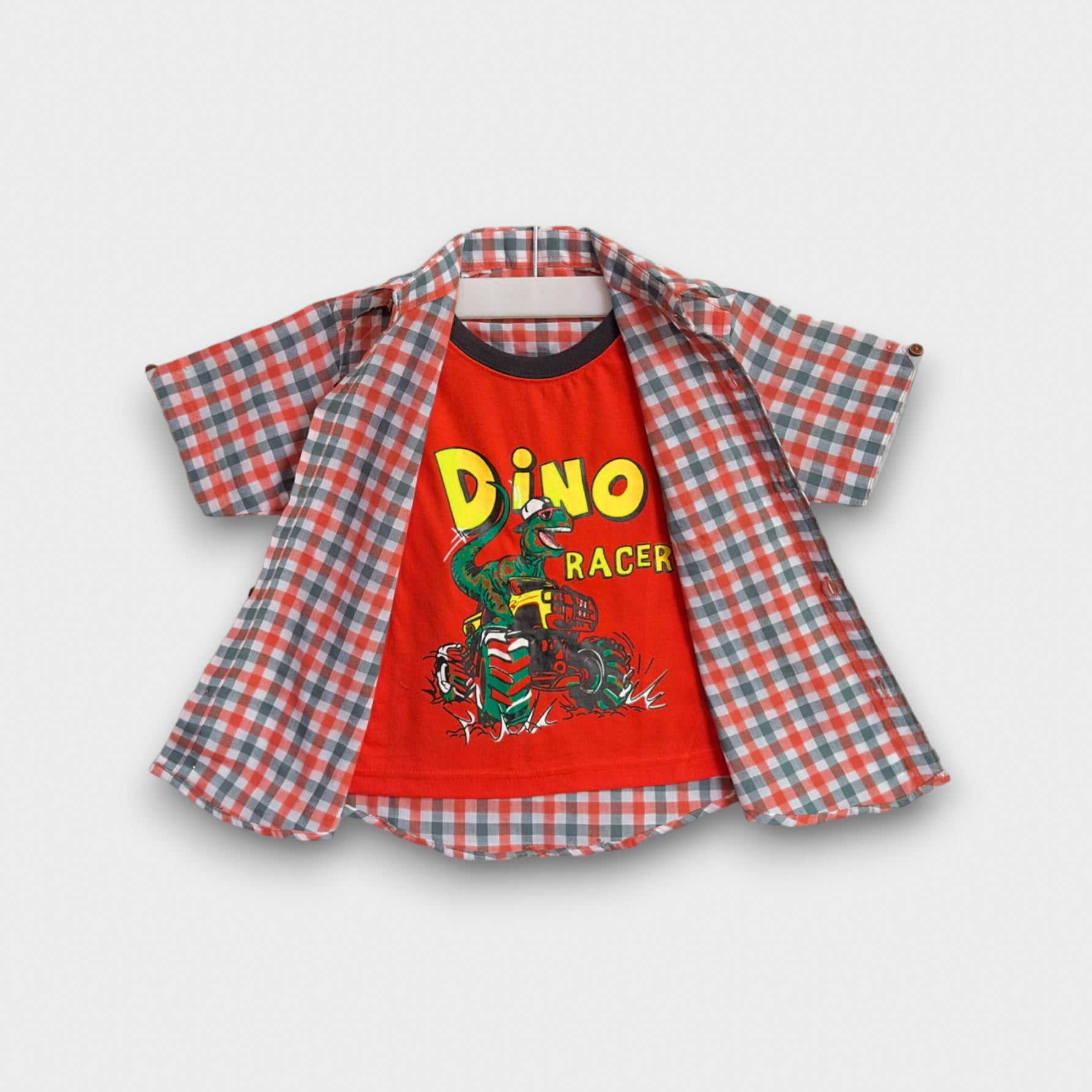 Get ready for a day of fun with the Dino Racer Plaid Flannel Casual Shirt! ๐ This stylish two-piece set features a classic checkered button-up shirt in red, white, and green, paired with a vibrant orange graphic tee underneath. ๐ Made from a soft and breathable fabric blend, this combo ensures all-day comfort. ๐ฟ The relaxed fit and short sleeves with button details make it perfect for casual outings, school days, or weekend adventures. ๐งฅ The layered look adds a touch of style and versatility, allowing your little one to wear each piece separately or together for a complete outfit. Perfect for the active kid who loves both style and comfort! ๐โจ