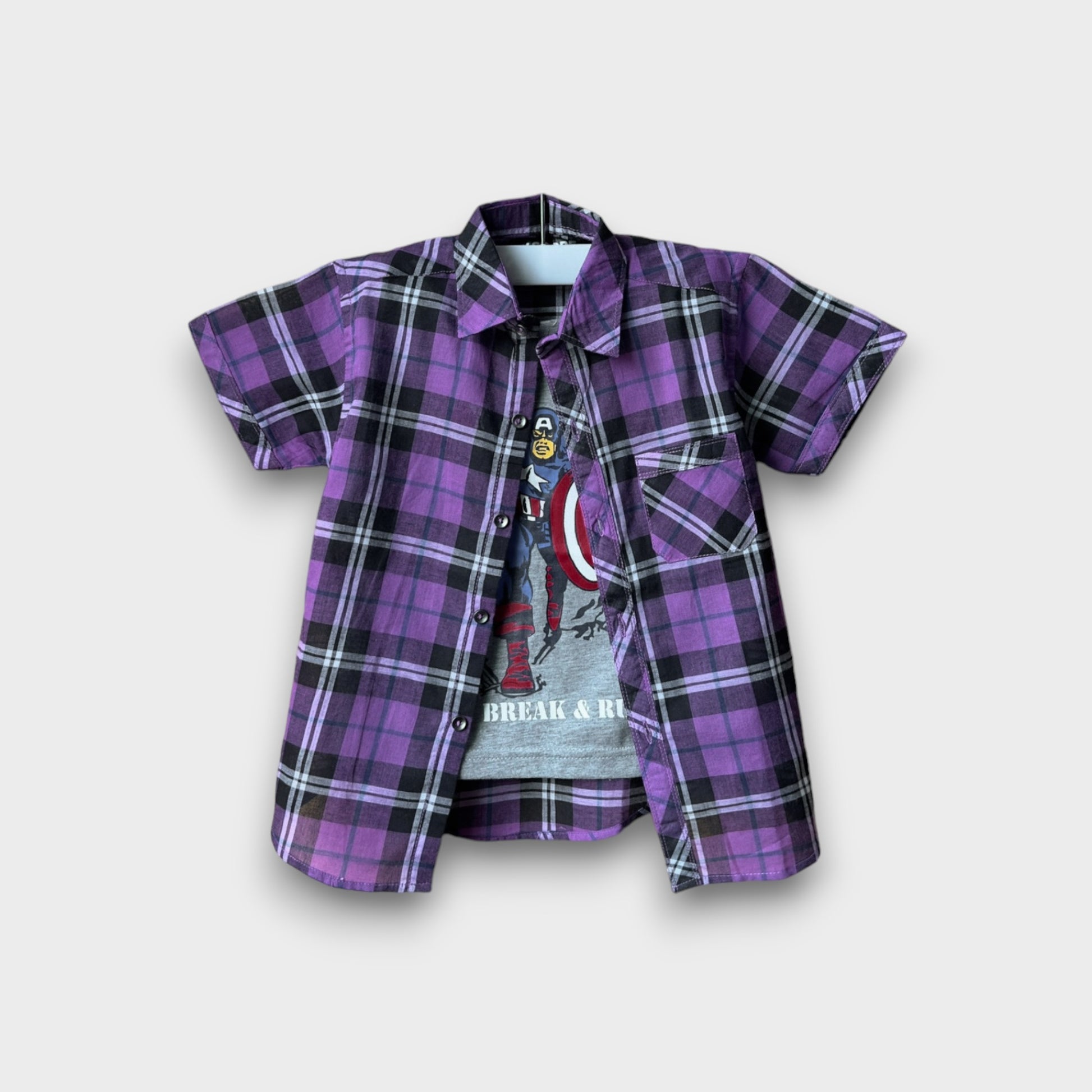 Unleash your inner hero with the Marvelous Plaid Flannel Casual Shirt! π This dynamic two-piece set features a trendy purple and black checkered button-up shirt, perfectly complemented by a superhero graphic tee underneath. π¦ΈββοΈ Made from a soft and breathable fabric blend, this combo ensures all-day comfort. πΏ The relaxed fit and short sleeves with button details make it ideal for casual outings, school days, or superhero adventures. π§₯ The layered look adds a touch of style and versatility, allowing your little one to wear each piece separately or together for a complete outfit. Perfect for the active kid who loves both superheroes and fashion! πβ¨