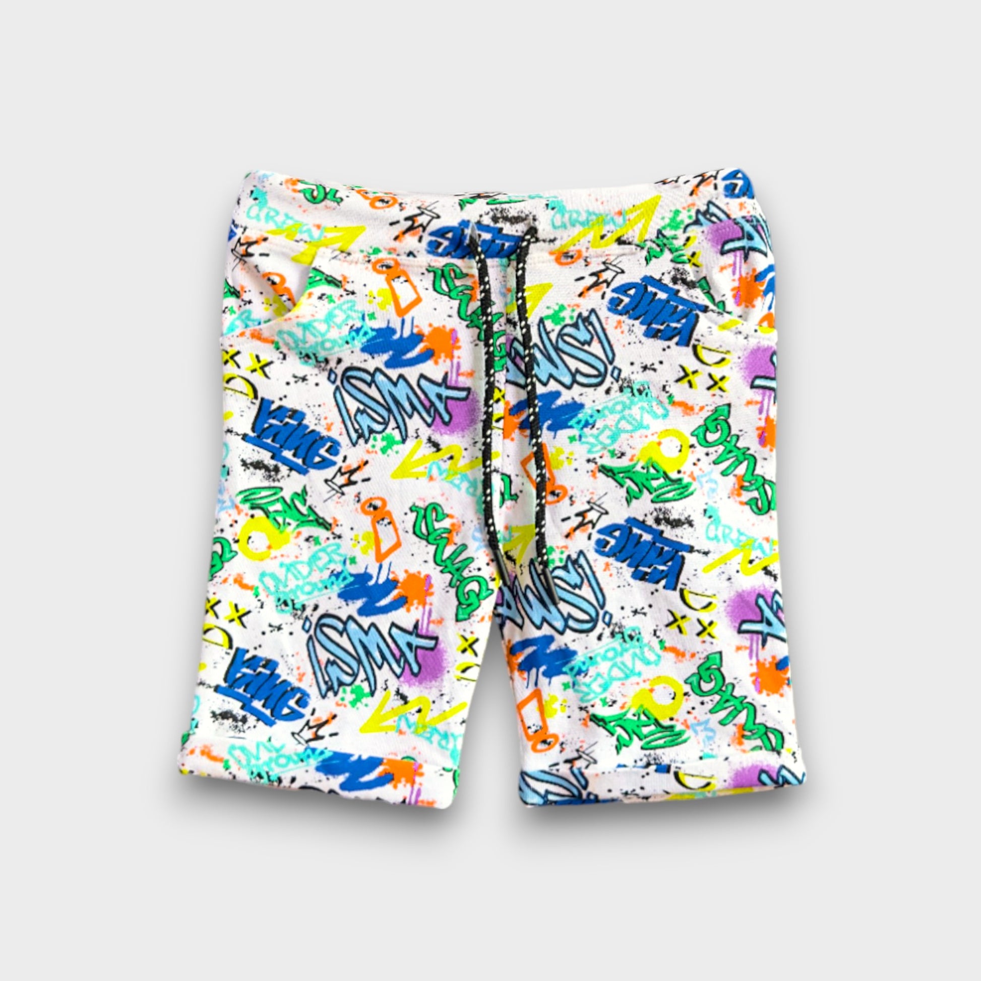 These 3quarter shorts showcase a colorful mix of graffiti tags and urban art elements. Ideal for the energetic and playful child who brings city vibes wherever they go! 🏙️🕶️