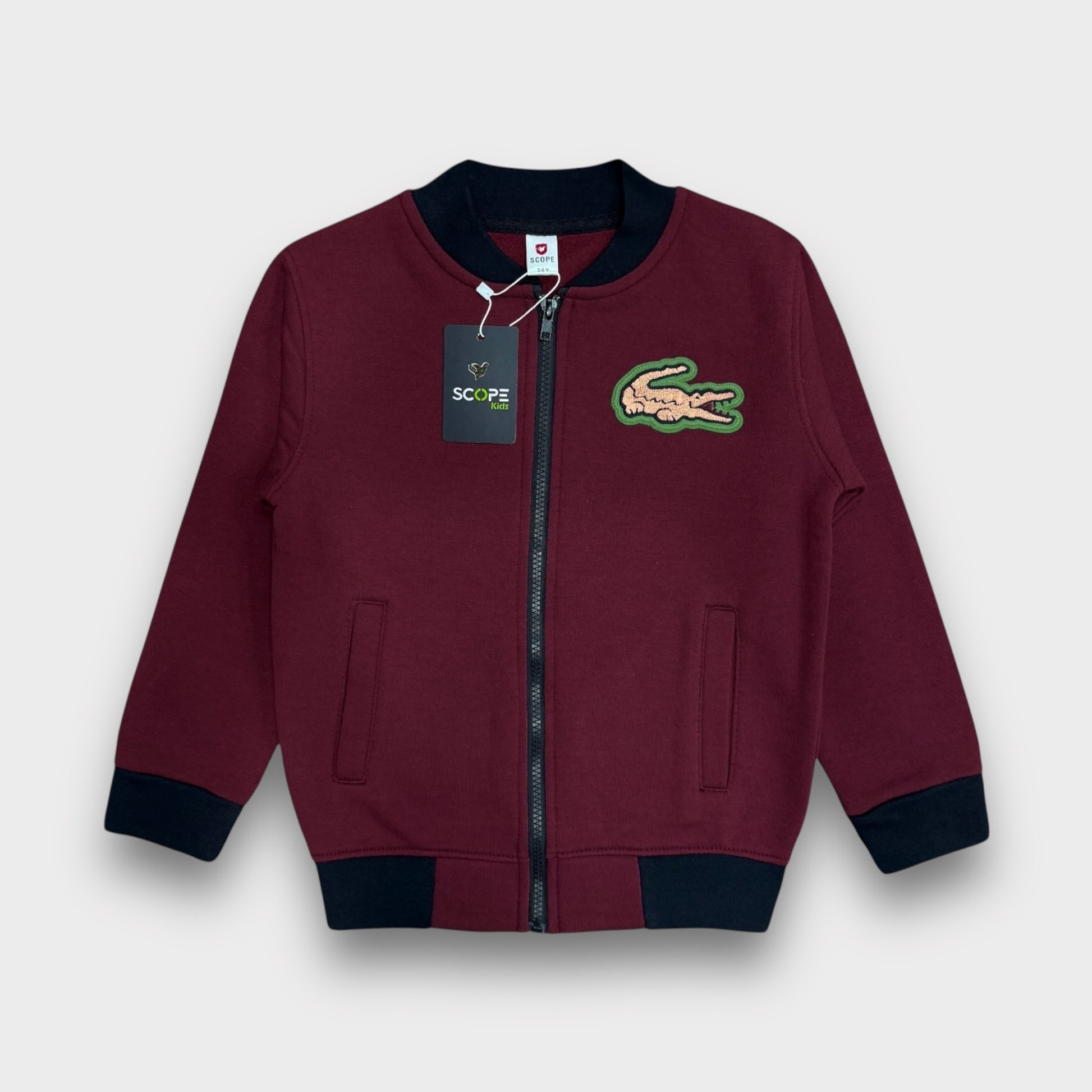 š§„ A stylish maroon jacket with a bold š patch & sleek zip-up design!